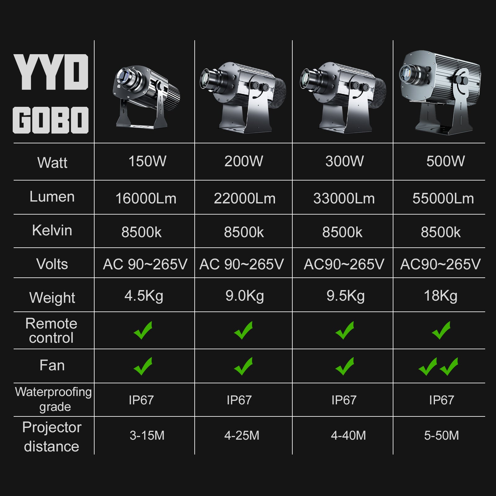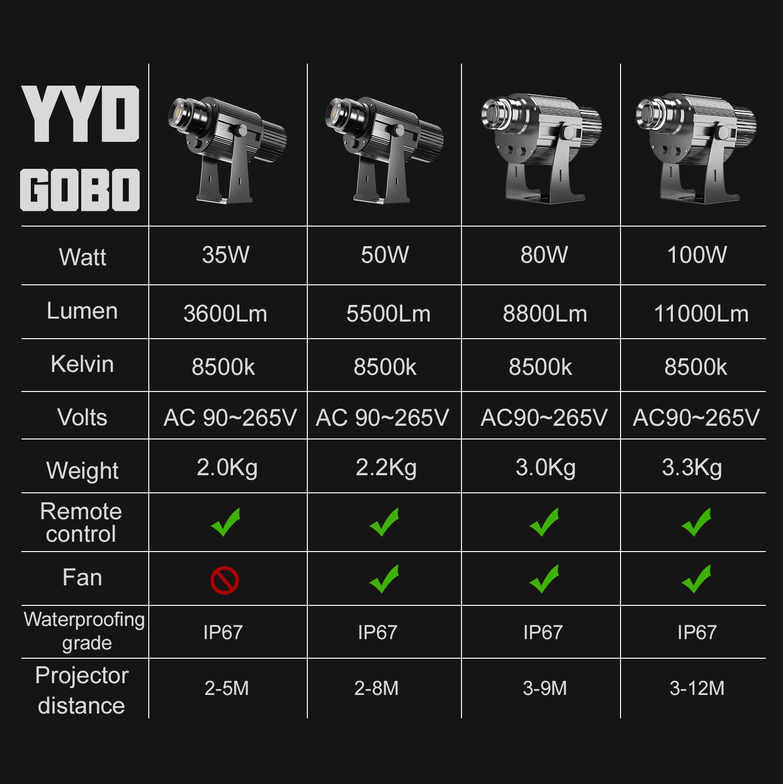 Please purchase the appropriate wattage according to the projection scene you need, contact us if you have questions